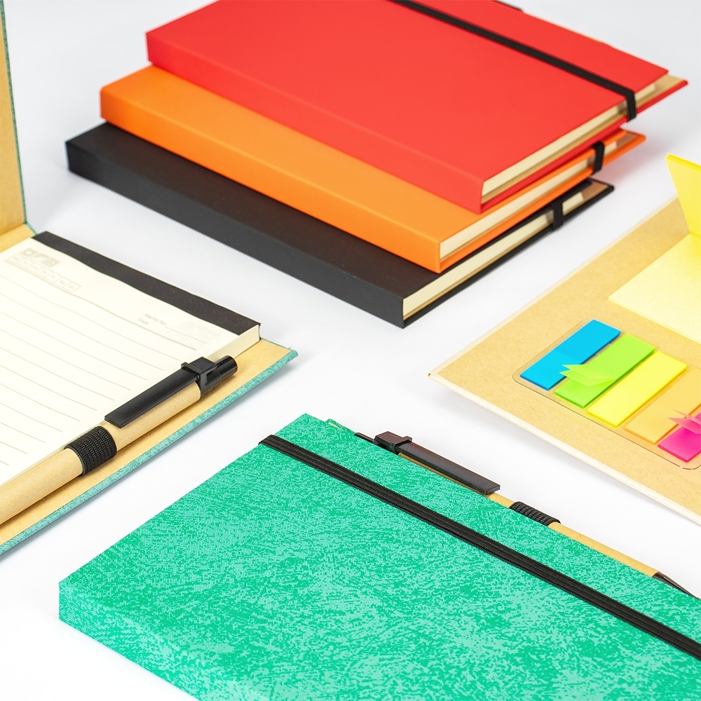 Bloco de anotações com capa revestida em papel especial e fita elástica para fechamento. Contém aproximadamente 80 folhas amareladas destacáveis com pauta, além de um bloco com cerca de 20 folhas autoadesivas amarelas e aproximadamente 100 marcadores de página autoadesivos, divididos em cinco cores diferentes. Acompanha uma caneta esferográfica com carga azul de 1.0mm e acionamento por clique, corpo em papelão e demais componentes em plástico.